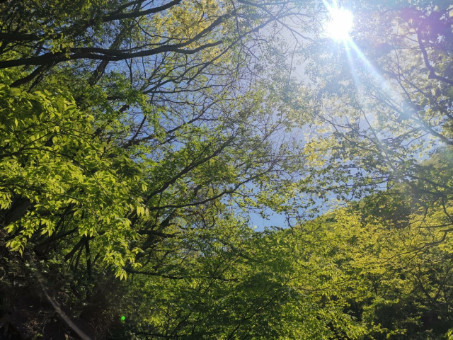 上りではすぐに沢があり水のせせらぎを聞きながら、新緑もまぶしく