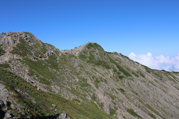 景色を堪能したので、小仙丈ケ岳へ向かいます。こちらのコースはなかなかハードな登りでしたので、こっちを登りに使わなくてよかったです。ちょっとした岩登りがありましたが、なんとかクリアして小仙丈ヶ岳の山頂に向かいます。
