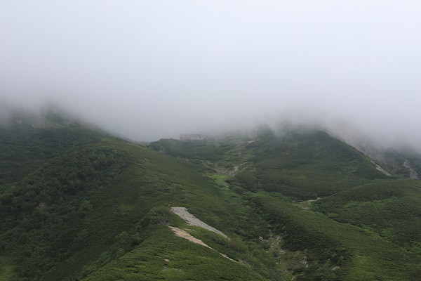 馬の背ヒュッテから先、稜線に出るまでは急登です。稜線に出ると、仙丈ケ岳が目の前にドーンと見えるはずでしたが、ガスが出てきてしまい山頂は隠れていました。仙丈小屋はどうにか見えましたが、まだまだ上のほうです。ちょっと休んでから、最後の急登に向かいます。