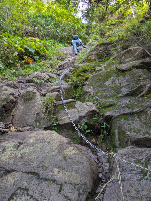 しんどかったのは鎖場の間の急斜面の登りです。心拍数が爆上がりし、とにかく体力を持って行かれます。