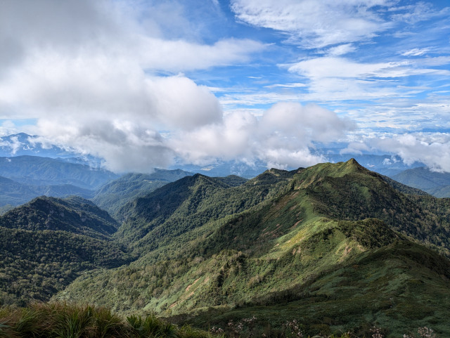そこからは背の高いハイマツ帯が続き緩やかな稜線を進んで約40分ほどで山頂に到着。眼前の剣ヶ峰がめちゃ尖っててかっこいいです。