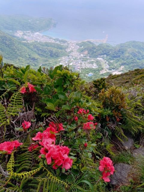 荒涼とした砂地に見頃を迎えたオオシマツツジが彩りを添え、「花の百名山」の名にふさわしい光景だった。