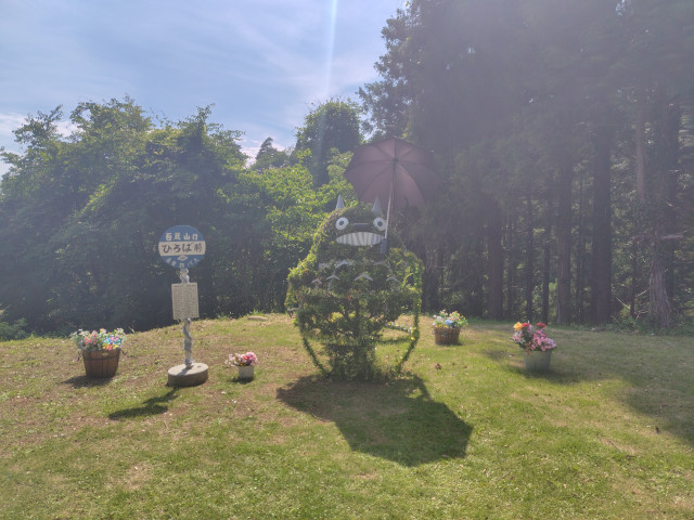 軽く休憩をとったあとは、いよいよ下山。途中、地域の方の手作りの「トトロ広場」に立ち寄りました。大きなトトロと一緒に傘をさして記念撮影!!木の上にはネコバスや真っ黒クロスケもいて、かわいかったです。
