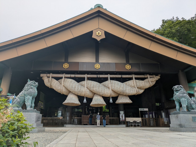 人が居ない音も無い福原駅に降り立ち常陸国出雲大社に向かいました。御祭神 大国主大神に ”あらゆる良縁への導き”を願っての参拝です。境内に到着すると拝殿に続く道は急な上り坂で心が折れそうになりましたが、その先に大きなしめ縄がチラリと覗かせ、はやる気持ちになりました。拝殿の前に立つと、長さ16m、重さ6tの大しめ縄は圧倒的存在感でした。