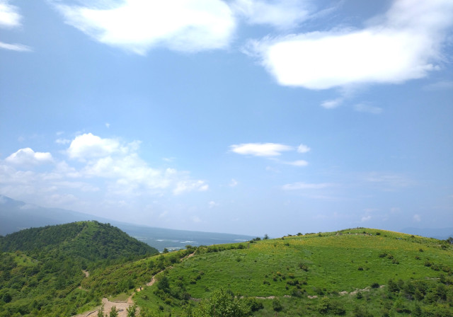 山頂までの道のりがすでに見える、飯盛山へ。ときどき振り返り、さっきのニッコウキスゲの丘を眺めながら山頂を目指します。