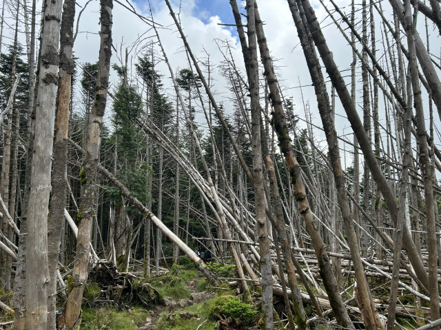 展望台の手前で突然、立ち枯れた木々が現れました。調べるとこれは「縞枯現象」といい、等高線方向に帯状に樹木が集団枯死する現象で、遠くから見ると立枯れた樹木の幹が白い縞のように見えるとのこと。貴重な森林生態系で保護林に指定されています。