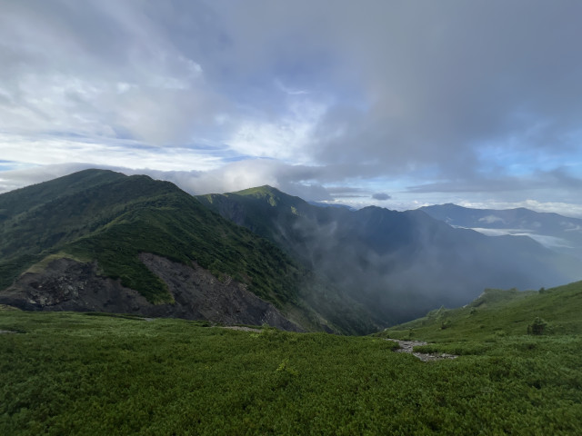 烏帽子岳、到着時は雲に覆われて何も見えず。ただ少しづつガスが切れて先の稜線もみえてきて前小河内岳まで進むことに。進んで行くとさらに周りがクリアに。前小河内岳、小河内岳もくっきりと見えて気持ちのいい稜線歩きを楽しめました。
