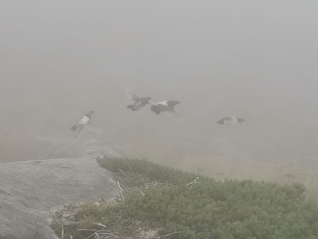 宝剣山荘手前で、4、5羽のライチョウの群れに遭遇しました。おそらく親子だと思われましたが、雛も親鳥と同じくらい大きかったです。我々がしばらく眺めていると、ライチョウは近くの岩の上に集合しました。その直後、一斉に岩から飛び立ちました。「え!飛ぶの?」。ライチョウは飛ばない鳥だと思っていましたので、びっくりしました。