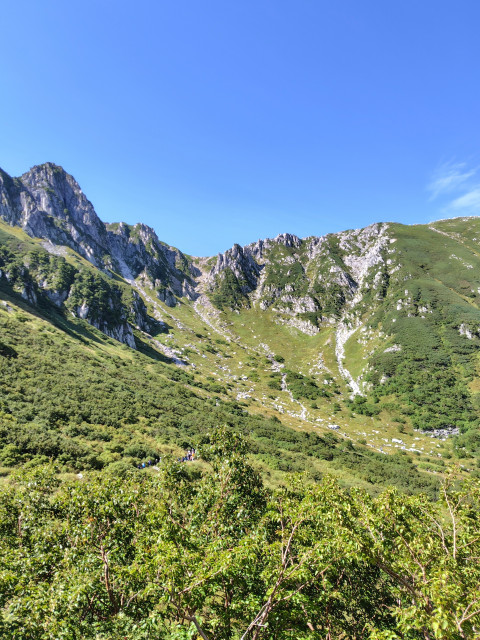 千畳敷カールは青空の絶景。斜面を登って宝剣山荘を経由し、中岳へ。中岳からは木曽駒ヶ岳がくっきりと見え、山荘前に並ぶカラフルなテントも気分を盛り上げてくれました。