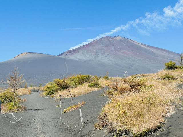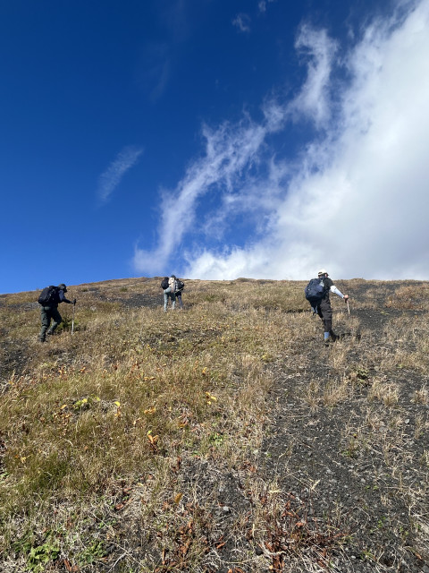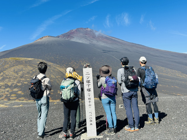 朝、御殿場口新五合目の駐車場に到着すると、目の前には雲ひとつない青空と、ドーンと大きな富士山!その美しさに思わず歓声が上がり、今日のハイキングへの期待が一気に高まりました。