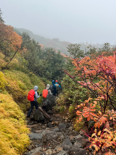 小一時間後、真っ白な息を吐きながら「眺望はいまいちだったけど楽しかった〜!」と笑顔で降りてきた「頂上隊」と合流。ここからは危険な箇所はなく、雨風も止んだのでサクサク下山。たった一晩で樹林帯の紅葉はより鮮やかに深まり、薄く霧がかった光景がなんとも幻想的で「雨の山もいいね!」と一同にっこり。ロープウェイとバスを乗り継いで、14時すぎには木曽福島まで戻ってきました。
