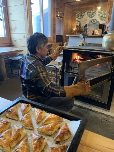二日目は雨予報だったため、6時半の朝食に合わせて起床。窓の外からは風がビュンビュン鳴る音が聞こえてきます。大丈夫かな?不安になりながらも美味しいご飯を平らげ(小屋番さんお手製の味噌を使った味噌汁が絶品!)さらに薪ストーブで焼き上げた名物のアップルパイを珈琲と共に堪能します。