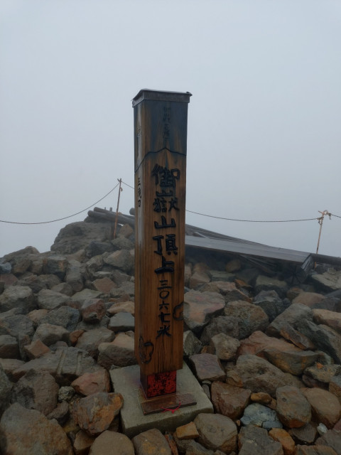 もう外に出たくないね〜なんて言いながらもレインウエアをしっかり着込んで、いざ出発。当初の予定は継子岳から池めぐりを楽しみ、頂上の剣ヶ峰を踏んで田ノ原へ降りるコースでしたが、この天気なので継子岳はカット。昨日と同じロープウェイ駅へと下る安全コースです。