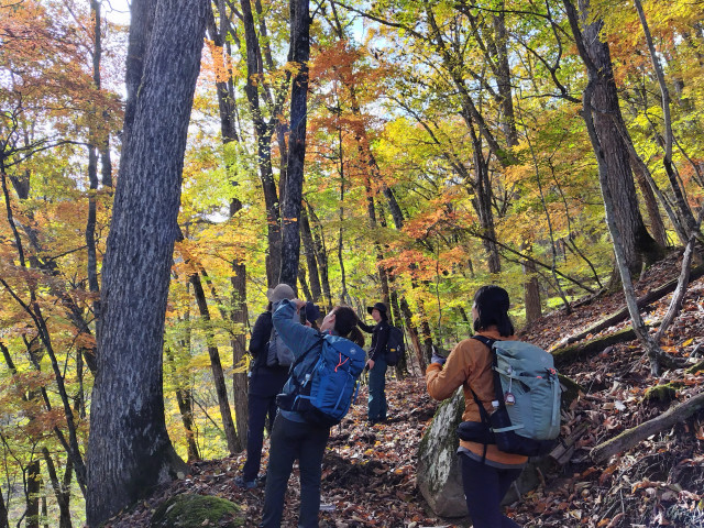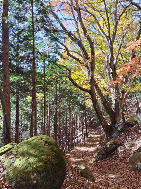 山の中はちょうど紅葉が進んできた感じで、黄色・オレンジ色の葉っぱの中に、時折緑の葉っぱが重なり、そこに空の青さも加わって、カラフルなモザイク画の中にいるような感覚。登山道は濃い緑色の苔や様々な種類の枯れ葉で敷き詰められ、歩くたびにガサガサと音を立て、緩やかに続く上り道を進んでいきました。ここでも他の登山客にはほぼ出くわさず、山ごと我々で貸し切り状態な感じです。