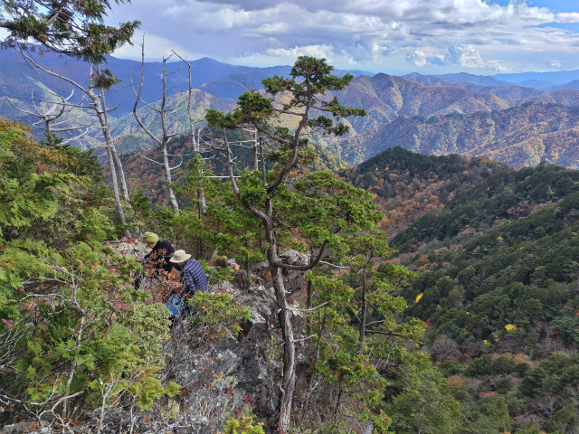 1時間半ほど歩き、今日一番の難所(?)である岩場を這いつくばって上がると、鶏冠山山頂に到着!山頂は思いの外スペースが狭く、小さな祠(鶏冠神社)が建っていました。すぐ下は崖になっていて、スリル満点。うっかり足を滑らせたら下に落ちてしまいそう。神様の敷地にちょっとお邪魔して、ここでお昼休憩に。