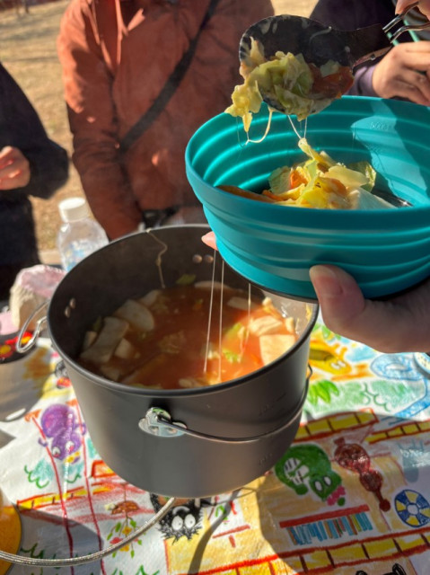 トマト鍋はチーズがとろとろで身体も温まりました。今回はSさんの初メスティンを使ってお米を炊き、最後は追いチーズを入れこれまたとろとろのリゾットを楽しみました。