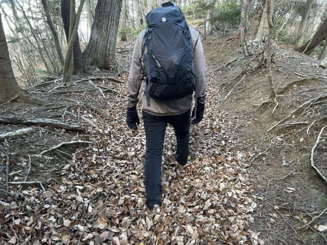 大丸から四方津駅までの下りは落ち葉の道が続き、足首が隠れるほど積もった場所も。人工林とは違い落葉樹の多い山だ。あまり整備がされておらず歩きにくいところもあるが、道標は多く道迷いは少ないかもしれない。