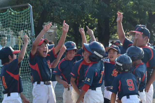 さぁ守りきって勢いづいたその裏、N井君がヒットで出塁し2塁まで進むと、とても4年生とは思えないバッティングセンスのS真君のセンター前タイムリーツーベース&とにかくデカいホームランバッターTAKUMI君のレフト前タイムリーで一気に同点!