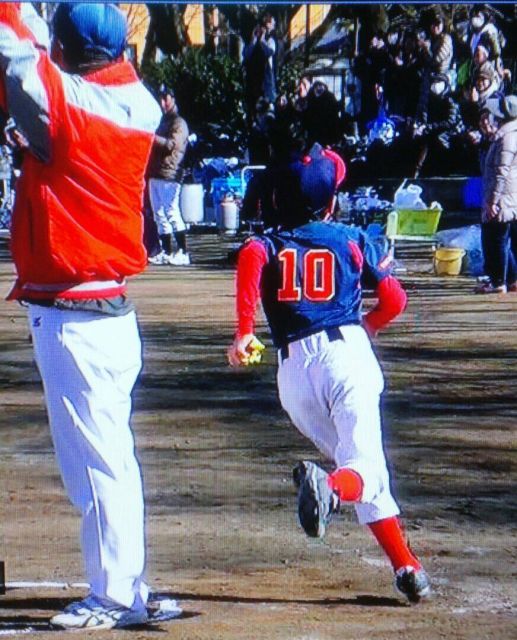 子供達からの「マリオ」の応援歌が効いたのか、いきなり長打でダイヤモンド1周をバテずに走りきり、なんと先頭打者ランニングホームラン!!!!!!!