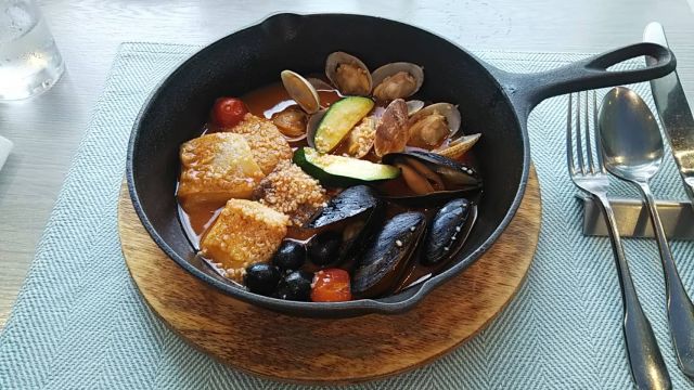 心配してた雨も朝には上がり、海を眺めながら、優雅にランチを頂きました。メインはお魚、お肉からチョイス。お魚はイタリアトスカーナ州発祥のカチュッコ。聞いたこともなかったのですが、ブイヤベースにちょっと似てて、美味しかったです。