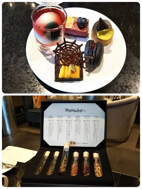 アフタヌーンティーは、黒いサンドイッチと黒いスコーン、目玉のジュレ、魔女の帽子、コウモリ、クモの巣のチョコなど、まるで魔女の館のよう。