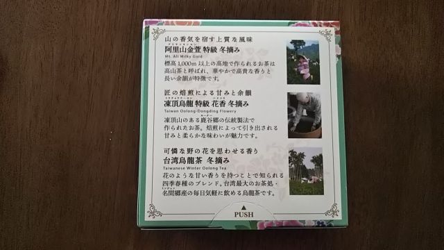花柄の箱には「阿里山キンセン 特級 冬摘み」、「凍頂烏龍 特級 花香(はなこう)冬摘み」、「台湾烏龍茶 冬摘み」の三種類が入ってて、中でもお気に入りが「阿里山キンセン」。茶葉も買いましたよ(^^)v