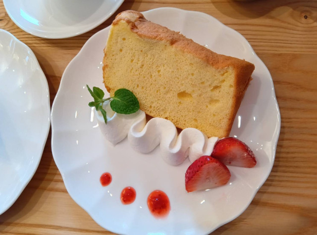 シフォンケーキは甘さ控え目。紅茶は種類が多く、軽目で優しいお味でした。