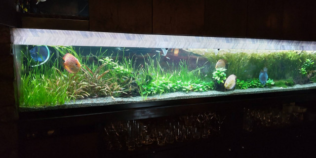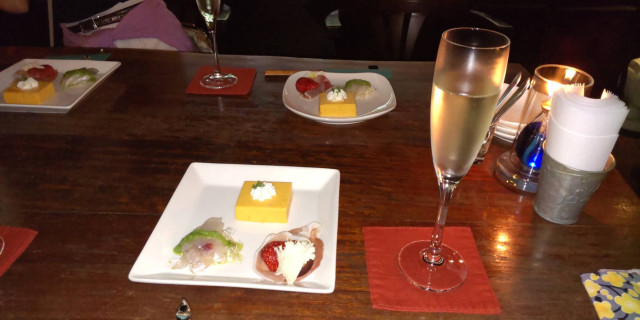 水槽のディスカス(お魚)を眺めながら、まずはスパークリングワインで乾杯!