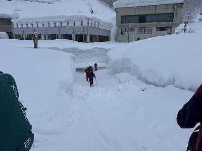 朝、起床して窓の外をみると雪がちらおり、予報を確認すると前日までの晴れ予報から一転、今日は雪模様とのこと。やや滅入りながらも6時に朝食をとり7時に宿を出発、7:30頃に除雪終了地点に到着。そこから出発して385号線を500mほど進んだところから尾根に取り付いた。明確なトレースがあったので、それに沿って尾根を登り続けたところ、650mあたりでトレースが消えており、参考にしていた過去ルートからも外れていることに気づいた。さっそくチェックして東方向に進路を修正して進むも、今度は700mあたりで、雪庇のある崖に行く手を阻まれた。やや迂回して尾根を登り続け、ようやく800m辺りで登りトレースを発見し進んだところで、リーダの近堂さんから視界も悪くガスも出てきたのでこの先の860mの小ピークで本日の登攀は終了との指示が出た。なお、下山ルートはムジナ沢の1本手前の沢の左岸を下り、出発地点付近に下ることにした。沢筋では楽しみながらも慎重に下り、出発地点に戻った。悪魔のいたずらかその頃には天候はすっかり回復して青空となっていた。(>_<)