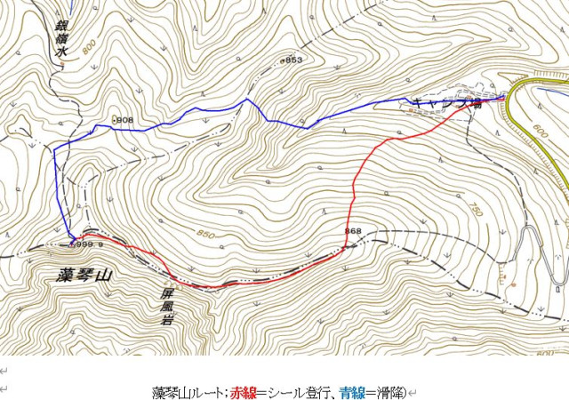 湖へ下る斜面は雪質さえ良ければ楽しそうで、実際屏風岩付近から降った記録もある。歩き易い稜線上を西に辿り、屏風岩付近は右側(北側)を巻くと頂上直下の鞍部に到着した。藤田さんは果敢にシール登行で頂上まで登ったが、狭くて凹凸が多いので他メンバーは鞍部に板と荷物をデポして往復。標高1000mの山頂はやはり風が強くて寒かったので、写真撮影もそこそこに鞍部まで下った。