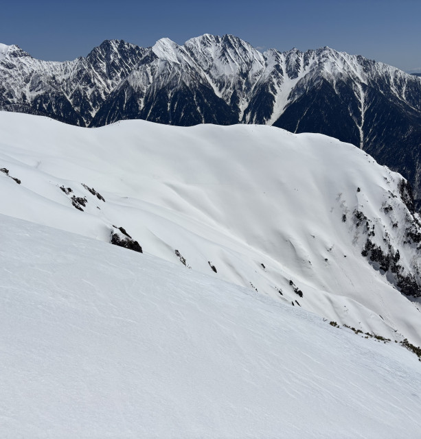 比較的安定した雪質の斜面まで行き、滑りました。左には穂高、正面には焼岳・乗鞍と絶景のなかのクルーズは最高でした!