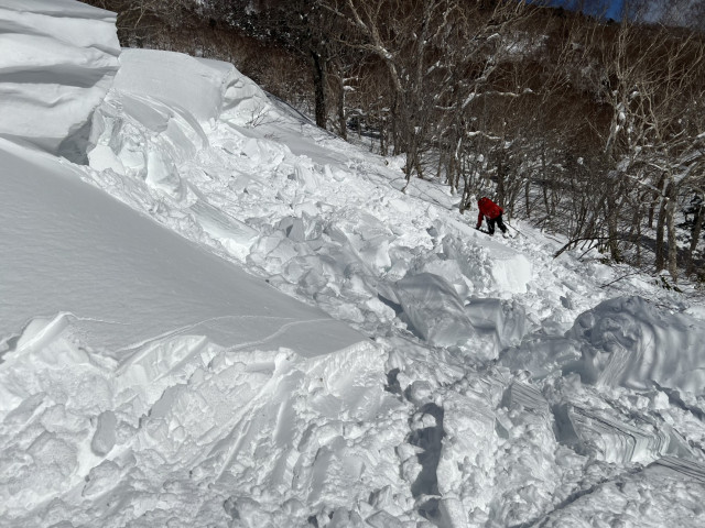 ◦ 障害物: 全体的に雪が少なくヤブが濃い状態で、隠れ穴や露出した木の根への接触に注意が必要でした。滑走中に転倒したり、穴にはまる場面も複数ありました。