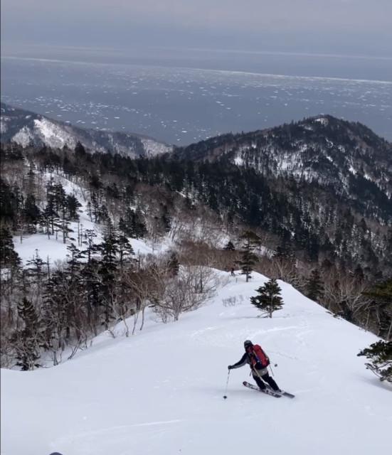 やがて眼下にはオホーツク海が広がり、海面にはまだ流氷が残っていた。白い海と雪面がつながるような景色の中を滑っていく時間は、この山域ならではの特別なものだった。