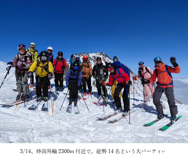 天気予報がはっきりせず中々行先を決めづらかったが、日曜より土曜の方がまだ良さげと見て土曜日に三田原山を滑ることに決めた。早朝、自宅の窓から妙高山のモルゲンロートが雲間から見えて、「ひょっとすると雲海になって上は良いかも」と想像した。杉ノ原ゴンドラ乗り場で、前日から「お会い出来たら」とコンタクトがあった市橋隊3名も合流。総勢14名と、あまり経験したことがない大所帯となった。