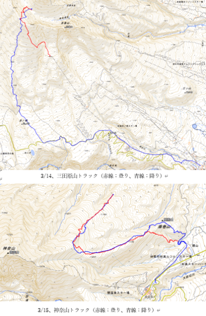 南面の降りから市橋隊と別れて、11名で滑り始める。三田原山南面は地図でも分かるように、かなりの標高差がある。最初中々良い雪質で快適に滑っていたが、次第に重くなると同時に樹林が濃くなり、さらにギャップが大きい地形になり、たまらず後ろから「休憩下さい」との声。池ノ峰の東を巻くことを確認して平地に降りると、ストップスノーで手漕ぎを強いられた。今年板を新調してワックスもしっかりかけている鍋倉さんの滑走性が素晴らしく、彼女が漕がなくても追いつかれてしまう。それでも、林道と長いゲレンデ滑走を終えて、第1リフトに乗ったのは15時過ぎ。無事に1日目を終えたことに深い満足感を得た。