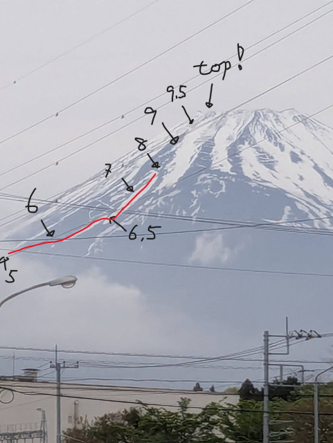 ↑本日の行程(赤線)、数字はn合目。