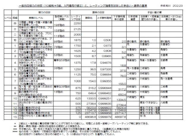 棋力のめやす表を改訂しました。今まで10級制でしたが、ごく初級者を想定し11~15級を追加しました。また、1級差=レーティング125相当として昇級基準を変更したのにあわせ、こちらの表も修正しています。初段をレーティング1850・10級位をレーティング625・駒の動かし方を覚えたばかりのレベルをレーティング0として、10級差でレーティング差1250と割り付けました。これは初級者~初段までの子どもが在籍する将棋教室の平手対局データ(1300局程度)を分析し定めたものです。もしかすると1級差=レーティング差100でもよいかも知れません。クラブの様子を見て適宜、調整していきます。