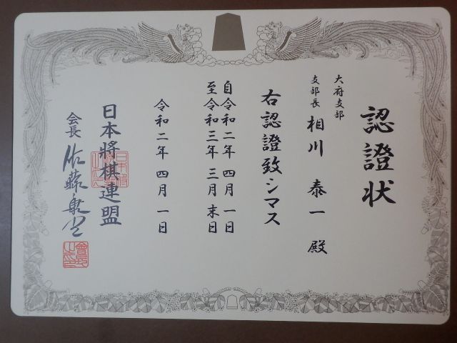 本日3月19日、日本将棋連盟から大府支部の認証状が届きました。