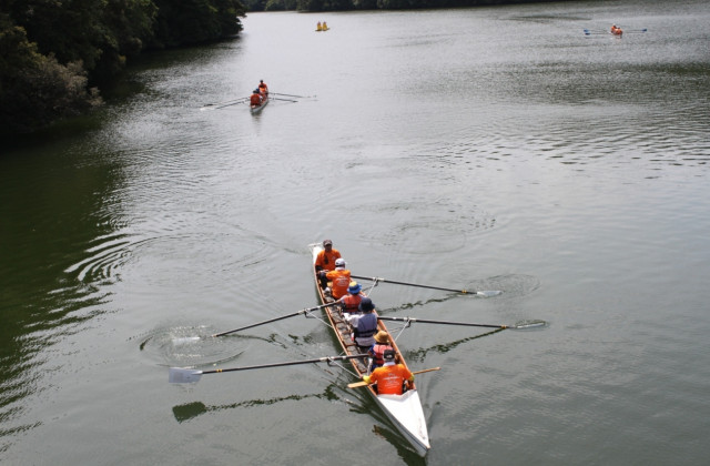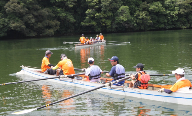 第二回目のボート体験教室(7月23日)を実施し、午前9名、午後9名が漕ぎを体験してくれました。4人乗りのナックル艇に3名づつ乗艇してもらいましたので、3艇が同時に湖に浮かびましたよ。最後にレースも行い、皆必死に漕ぎましたわ。楽しい体験だったという感想をいただきましたので安堵しました。8月も参加したいと申込んで帰られた家族もいらっしゃいましたね。