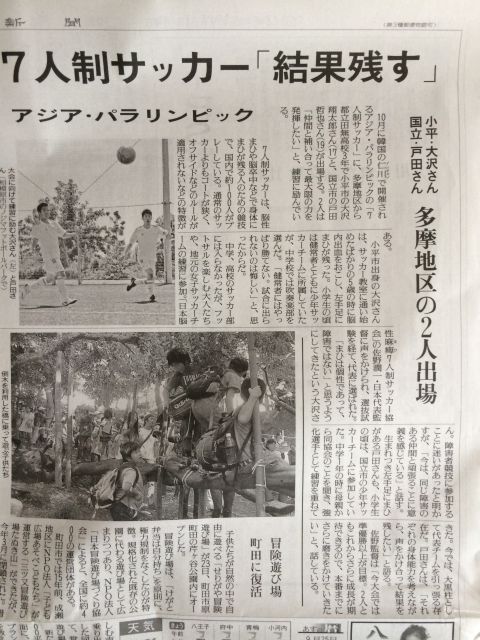 今週水曜にCPサッカーに関する新聞記事があったのでアップします。10月に韓国で開催されるアジアパラリンピックの正式種目で、脳性まひ等で体に麻痺が残る人のための7人制サッカーとして紹介されていますが、その中になんと国立市の戸田選手が写真付きで取り上げられています!