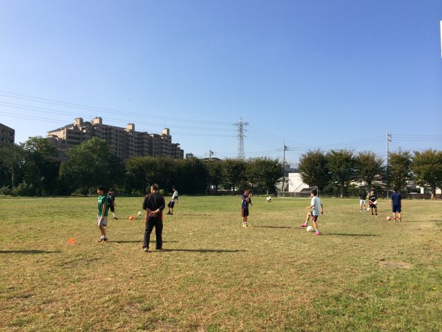 基礎練、二人組インサイド、ヘディング、インステップの後、シュート練、左右。最後にミニゲーム紅白戦。