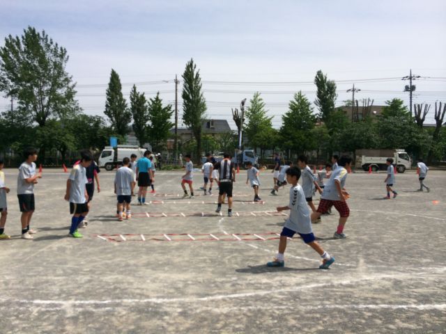 ランニングのあとラダー、基礎練、2人組、その後インサイド練習、ヘディング練習、最後はミニゲーム、フットサルルール。
