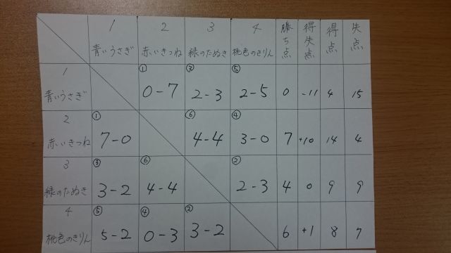 青いうさぎ、赤いきつね、緑のたぬき、桃色のきりん、の4チーム