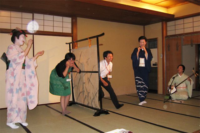 ねね子さんの艶やかな着物姿、凛としたたたずまいの菊乃さん、時を忘れて楽しませてくれる名調子の梅香さん、私たちは三味線が奏でる音色と芸妓さん踊り、おもてなしに次第に引き込まれていきました。