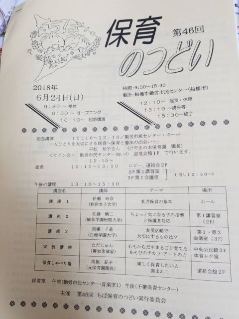 6月24日、勤労市民センターにて第46回保育のつどいが開催され、本年度は連絡会から事務局長の今仲が実行委員長を務めました。けやきの木保育園園長の平松知子さんによる「一人一人を大切にする保育~保育と憲法の出会い~」の講演では、保育士から見た保育園、父母との関係の難しさなどを中心に保育の現状や問題点が挙げられ、「保育は福祉であるべきだが、消費者サービスへ移行しつつあり、子どもの発達や心は置き去りにされたり、父母受け重視の保育園へと変わりつつある」と指摘しました。全ての子どもたちに平等に、良質な保育を受け続けられるように保育者と父母が一丸となり保育の質の向上を訴えなくてはならない、「良質な保育を受けた経験は、その子の人生の糧となる」と保育の重要性を訴えました。(文責:今仲希伊子)