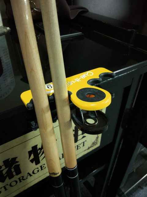 日本のビリヤード場では、ビリヤード台の横のテーブルに立て掛け用スタンドが設置されていることが多いですが、こちらではその様なビリヤード場は多くないので、自分が使っているキュースタンドはとても役に立っています。