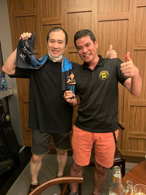 次回幹事のバーチャルG藤さんから優勝カップ授与二年足らずの期間でしたが、サムサラ北Gさんのクラブでの思い出話で試合後の壮行会は大盛り上がりでした。今回体調不良で月例会に参加できなかったマッチョA木さんも駆けつけ、メンバーからのささやかなプレゼントを贈呈しました。