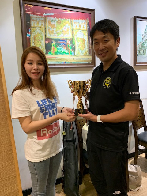 前回チャンピオンからトロフィー授与大変残念なお知らせですが、TCB名誉会長・石牌村の見回り人など様々なニックネームを持つ現GBCキャプテンのチョンのMちゃんが8月初旬に帰任することになりました。とにかくビリヤードの練習と研究に熱心で、月例会では常に上位に顔を出す誰もが認める実力者ですが、不思議と優勝にはまだ縁がありません。7月の最後の月例会で優勝し、北Gさんに続き優勝カップを持ち帰って欲しいと思います。もちろんメンバー全員で全力で阻止しますけど。