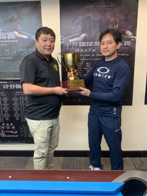 新しい優勝カップをキャプテンI城さんから授与