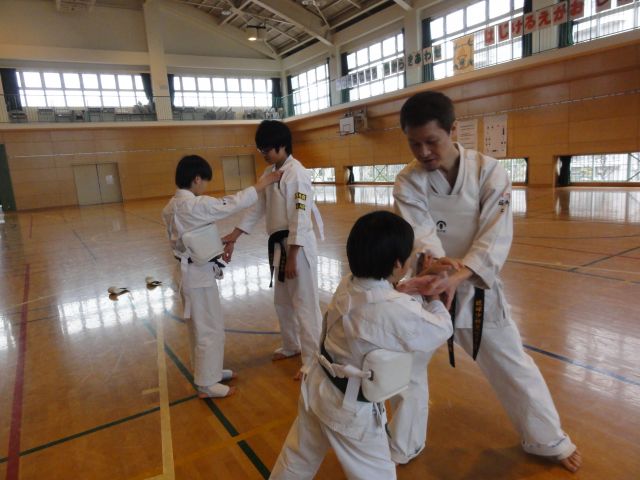 それぞれの昇級審査用の型を復習して、組手練習の時間で護身術の練習もしました。